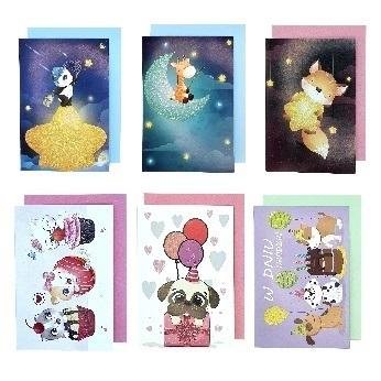 Miks wzorów, towar wysyłany losowo. Cena za sztukę.Kartka dziecięca składana. Nadruk z brokatem, hot stamp. Wymiary: 11,5 x 17 cm. przeczytaj całość
