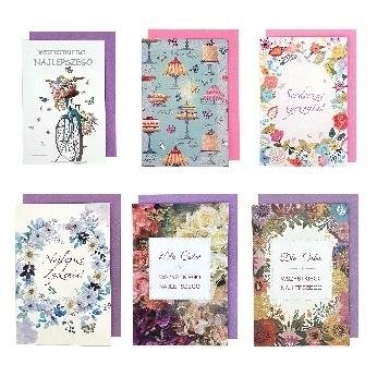 Miks wzorów, towar wysyłany losowo. Cena za sztukę.Kartka uniwersalna składana. Nadruk z brokatem, hot stamp. Wymiary: 11,5 x 17 cm. przeczytaj całość