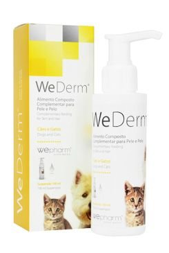 WeDerm 100 ml Pro zdravou kůži a srst Výživový doplněk pro psy a kočky s vysokým obsahem esenciálních mastných kyselin, vitamínů a minerálů určených k podpoře kožní funkce v případech dermatózy, svědění, vypadávání chlupů nebo jakéhokoliv jiného dermatologického projevu alergie. WeDerm ® zaručuje...