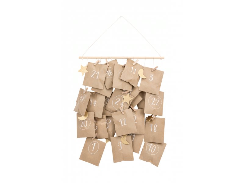 Adventní kalendář tvoří 24 sáčků, které po naplnění drobnostmi pro vaše dítě s pomocí kolíčků snadno připevníte k závěsné konstrukci. Obsah adventního kalendáře je jen na vás - do sáčků můžete vložit sladkosti, malé hračky, sušené ovoce apod. Součástí balení je i popisovač pro popsání sáčků čísly...