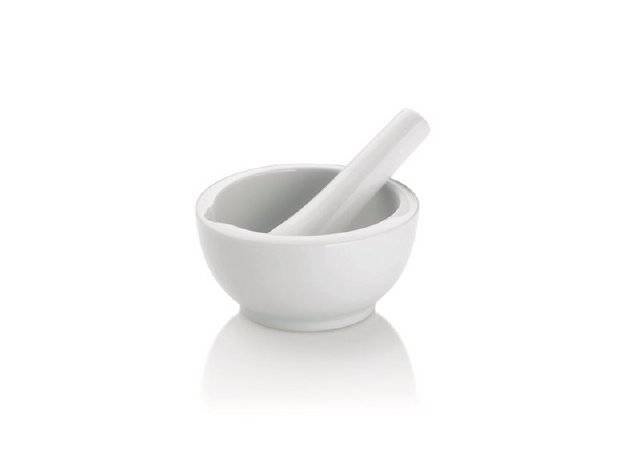 Bílý porcelánový hmoždíř s paličkou na drcení koření a přípravu pesta. przeczytaj całość