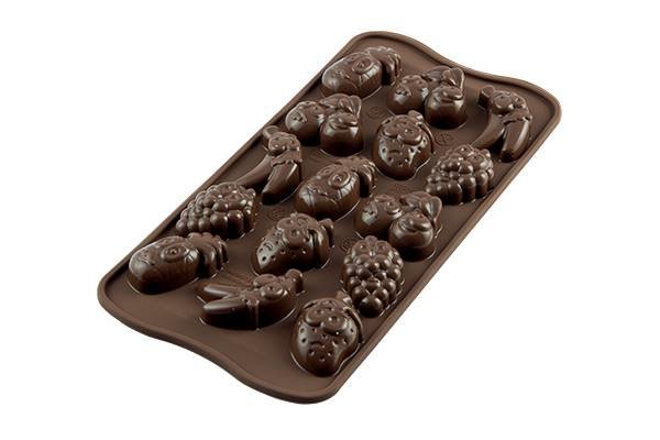 Nepřilnavá forma ze silikonu na přípravu patnácti bonbonů ve tvaru veselého ovoce s očima. przeczytaj całość