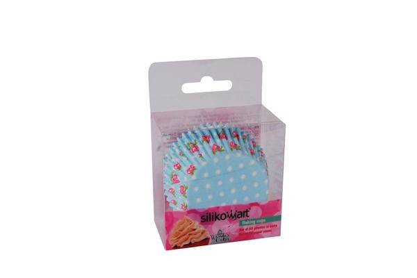Modré papírové košíčky s dekorem růží na pečení i servírování muffinů a cupcake. przeczytaj całość