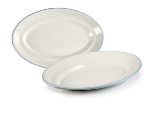 Smaltovaný talíř s ozdobnou modrou linkou. Průměr 36 cm. przeczytaj całość