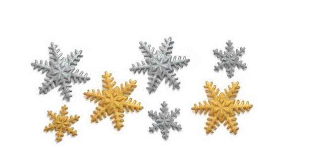 Cukrová dekorace ve tvaru zlatých a stříbrných sněhových vloček. przeczytaj całość