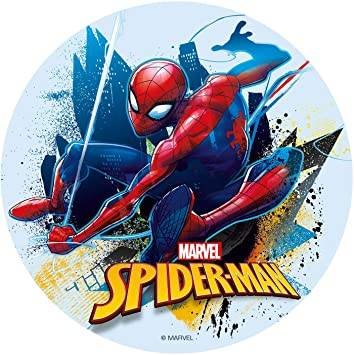 Arkusz z fondantu do szybkiej dekoracji tortu w kształcie koła z motywem Spidermana. Skład: Olej palmowy, modyfikowana skrobia kukurydziana, aromat (wanilia), cukier, dekstroza, glukoza. Barwniki: E102, E110, E122, E133, E151, E171. Emulgatory: E435, E471, E491. Konserwanty: E202, E330. Zagęstnik: maltodekstryna. Wymiary: 16 cm. Opakowanie: 1 szt.