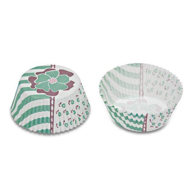 "Papírové pečicí formičky - košíčky s tyrkysovými květy a pruhy. Papírové formičky jsou vhodné na pečení muffinů a cupcakes. przeczytaj całość