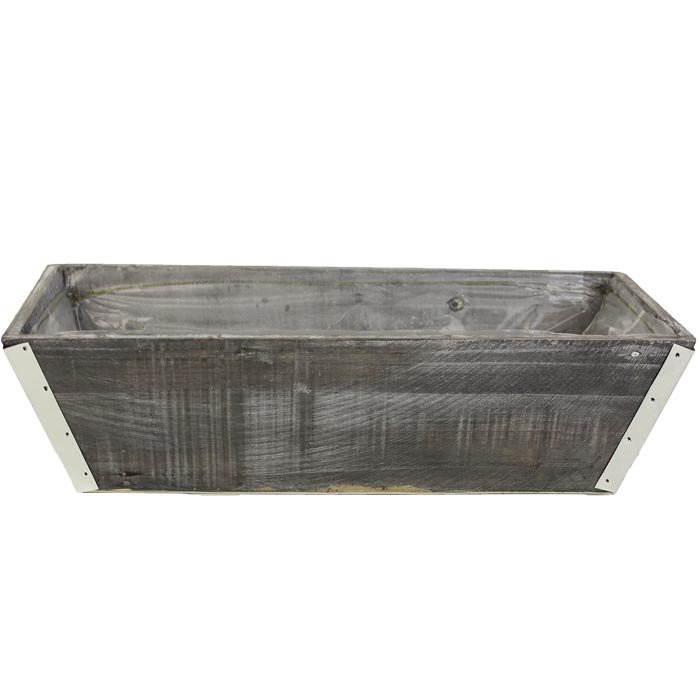 Dřevěný květináč / obal na květiny. Barva - šedá. Materiál - dřevo, na rozích je plechové kování. Rozměry - 40x17 cm, výška 12 cm, dno květináče 31x9 cm. przeczytaj całość
