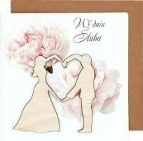 Kartka okolicznościowa z okazji Ślubu o treści: "Idźcie przez życie z dobrocią w sercu, otoczeni ludźmi których kochacie. Silni poczuciem bezpieczeństwa i szczęścia? Nierozłączni! Wszystkiego dobrego na nowej drodze życia." przeczytaj całość