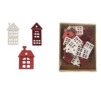 Sada dekoračních přízdob.Sada obsahuje 24 přízdob.Rozměry : 2,7 - 3 x 0,3 cm, výška 4 cm.Barva : kombinace červená, vínová, bílá.Materiál na bázi dřeva. przeczytaj całość