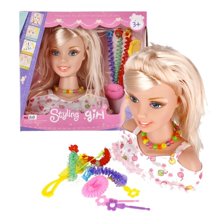 Obsah soupravy: stylingová hlava, barevný perlový náhrdelník, 4 x sponky, 3 x sponky s melírem, gumička do vlasů, hřeben.