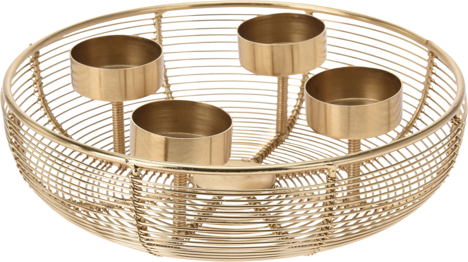 Krásný adventní věnec ve zlatém provedení v originálním designu se 4 kalíšky na svíčky. Věnec dokonale zapadne na jídelní stoly a do obývacích pokojů, kde si při světle jeho svíček naplno užijete kouzlo sváteční nálady. Vnitřní prostor věnce lze využít k dozdobení dle nálady. Materiál - kov. przeczytaj całość