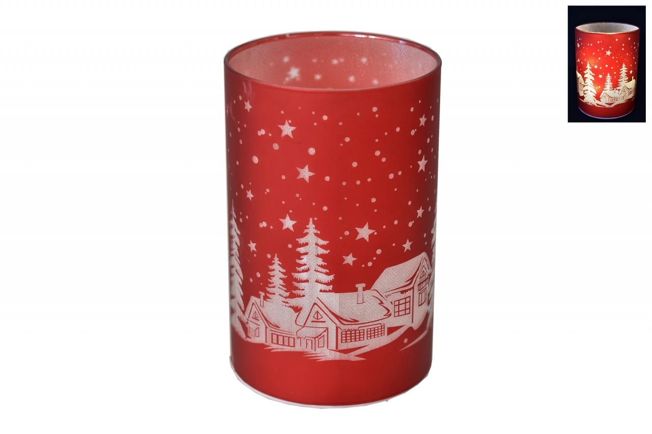Skleněný LED svícen s prosvítajícím motivem zasněžené vesničky. LED diod 10 ks, napájení 3x AA tužkové baterie. Baterie nejsou součástí výrobku.Materiál: sklo, plastRozměry:výška 14 cmprůměr 9 cm przeczytaj całość
