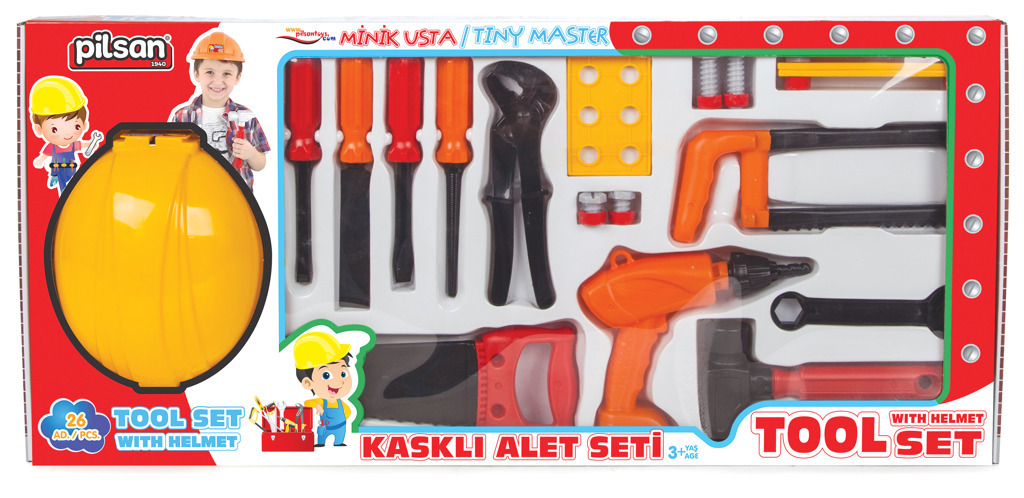 Velká sada s nářadím pro malé kutily.Ochranná helma na dětskou hlavičku. Dále ještě sada obsahuje ještě 25 ks různého nářadí – pilka,šroubovák,vrtač­ka,maticový klíč,hasák a další. przeczytaj całość