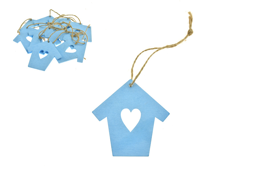 Dřevěná ozdoba, modrý dům se srdcem, 10 ks