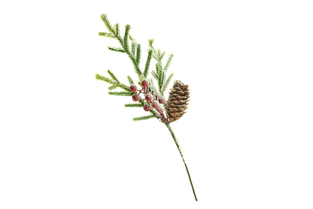 Vánoční větvička s jeřabiny, šiškou a jehličím se zasněženým efektem. Pro tvorbu Vánočních a adventních dekorací se tato větvička řadí jako základní část pro nádherné a poutavé dekorace.Celková délka 30 cmZápich je ohebný díky drátku przeczytaj całość