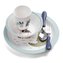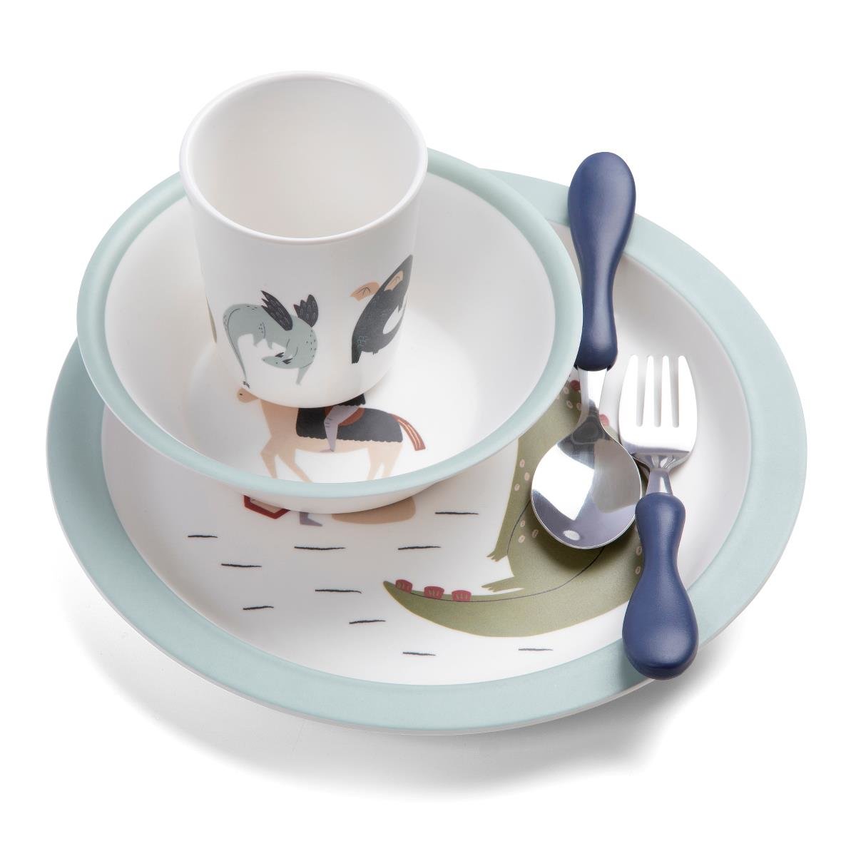 Melaminový set nádobí Roztomilý set nádobí s motivy z říše hrdinů a draků. Sada obsahuje pět produktů: plochý talíř, hlubokou misku, šálek a dětský příbor (lžíci a vidličku). Vhodné pro děti od 4 měsíců.Krásný set nádobí, který bude děti motivovat ke společnému stolování. V sadě najdete plochý...