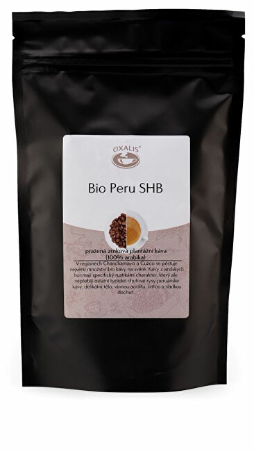 BIO Peru SHB je pražená zrnková plantážní káva (100% arabika). V regionech Chanchamayo a Cuzco se pěstuje největší množství bio kávy na světě. Kávy z andských hor mají specifický rustikální charakter, který ale nepřebíjí ostatní typické chuťové rysy peruánské kávy: delikátní tělo,vinnou aciditu,čistou a sladkou dochuť.