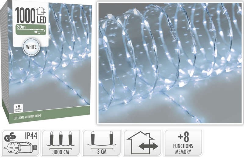 Vánoční LED světelný řetěz pro použití uvnitř i venkucelkem 1000 LED žárovek v barvě studená bílávykouzlí úžasnou atmosféru kdekoliv jej rozvěsíte, ať už na vašem domě, na zahradě, terase, balkóně nebo i uvnitř domumůžete libovolně přepínat mezi 8 různými světelnými efektynezbytná vánoční...
