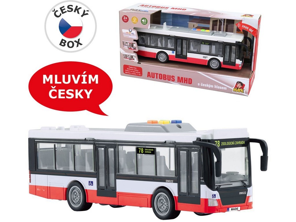 Autobus komunikacji miejskiej na koło zamachowe z czeskim głosem i efektami świetlnymi w realistycznym designie. Z pewnością ucieszy niejednego małego chłopca. Autobus posiada otwierane drzwi, które pasażerowie wykorzystują przy wsiadaniu oraz wysiadaniu na swoim przystanku. Autobus odtwarza następujące komunikaty: ,,Główny dworzec, następny przystanek Teatr Miejski.\'\',,Teatr Miejski, następny przystanek Ogród Zoologiczny.\'\',,Ogród Zoologiczny, stacja końcowa. Prosimy wszystkich pasażerów o opuszczenie pojazdu.\'\',,Czekamy na przyjazd kolejnego połączenia.\'\'Kluczowe cechy: autobus zapowiada stacje, czeski design znany z naszych miast, napęd na koło zamachowe, efekty świetlne, wymiary pudełka 26 x 10,5 x 16,5 cm. Zasilanie: baterie AG13 x 3 (w zestawie). Odpowiednie dla dzieci powyżej 3 lat.