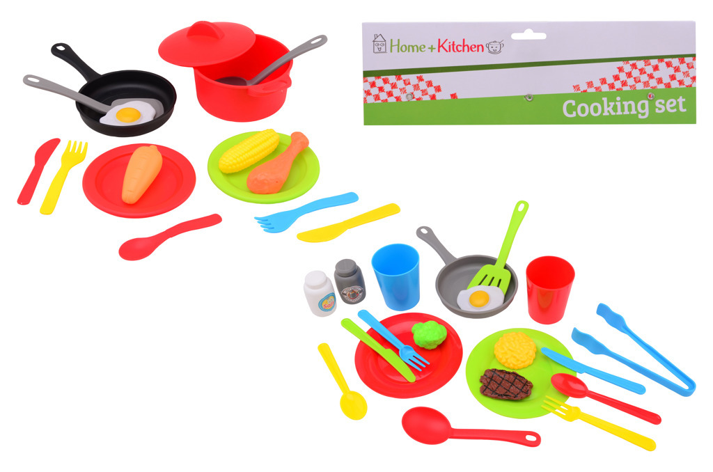 Plastová jídelní sada obsahuje pánvičku, příbory, hrnec s pokličkou atd. ale i plastové potravinky – vajíčko, kukuřii atd. przeczytaj całość