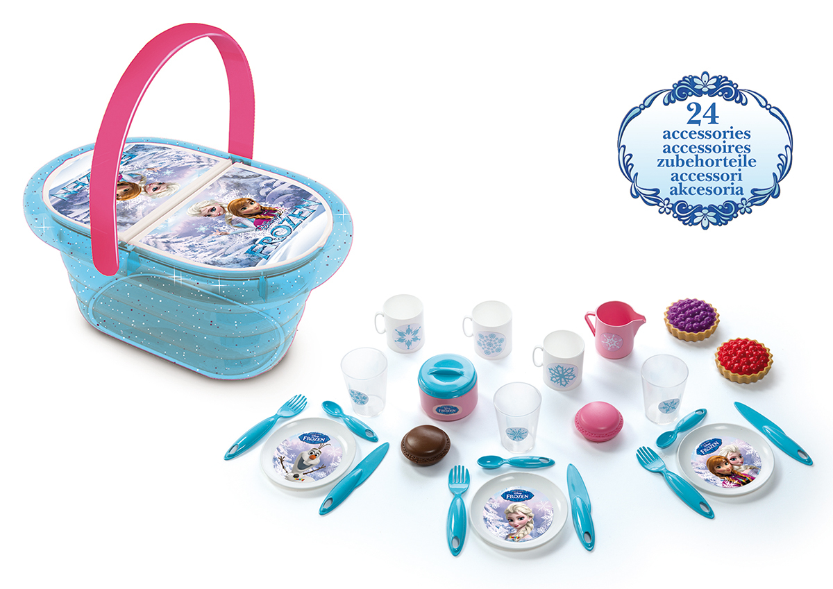Třpytivý košík s oblíbenými postavičkami z filmu "Ledové království" je perfektní na malý piknik. Košík má dvě víka, pevné madlo a obsahuje šálky, hrnky, talíře, příbory, konvičku na mléko, cukřenku a koláčky. Celkem obsahuje 24 ks. Rozměry: 25,8x19,5x12,8 cm. przeczytaj całość