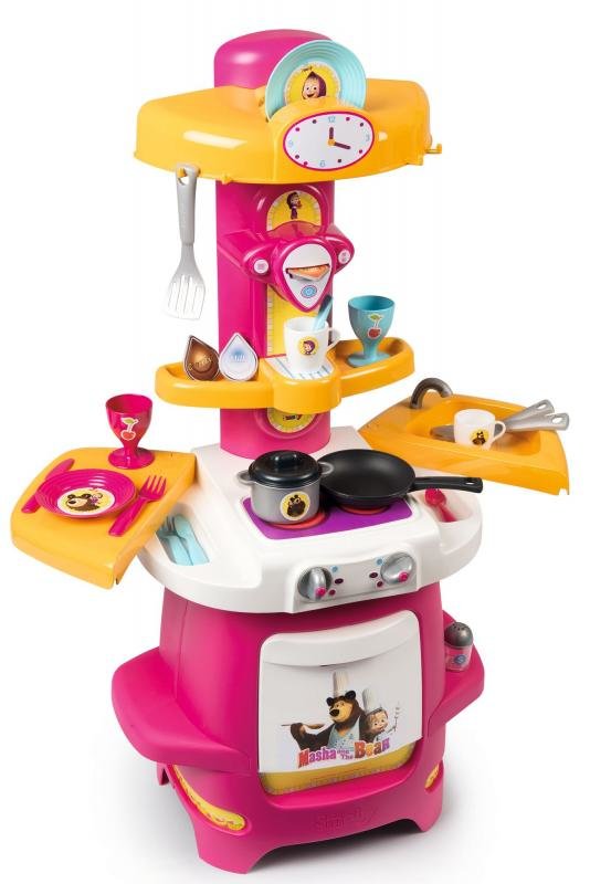 Kuchyňka ve veselých barvách s motivem postaviček z dětského seriálu Máša a medvěd. Nechybí dřez, plotýnky a trouba, kávovar na kapsle, hrníčky, skleničky a další. Celkem obsahuje 22 ks příslušenství. Výška kuchyňky 85 cm. Výška k pracovní desce: 40,5 cm. Rozměry: 65,8 x 85 x35 (DxVxH). przeczytaj całość
