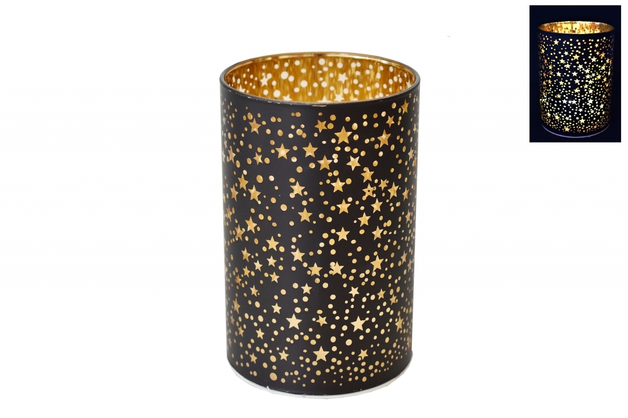 Skleněný LED svícen s prosvítajícím motivem hvězdiček. LED diod 10 ks, napájení 3x AA tužkové baterie. Baterie nejsou součástí výrobku.Materiál: sklo, plastRozměry:výška 14 cmprůměr 9 cm przeczytaj całość
