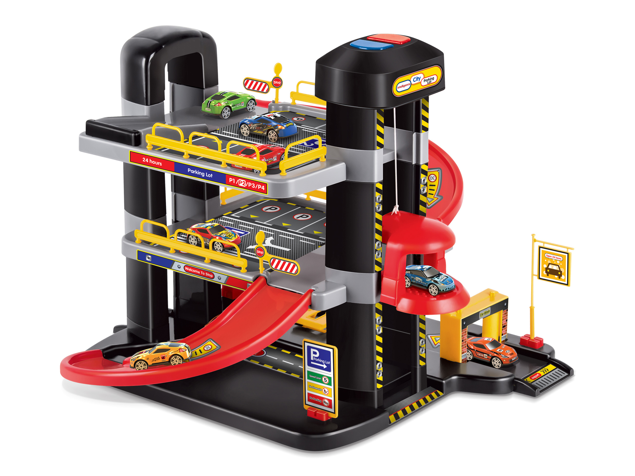 Třípatrová garáž s myčkou v sobě skrývá mnoho funkčních prvků! Vyvez autíčko výtahem až do nejvyššího patra garáže a spusť ho dolů po silnici! Natankuj, umyj auto v myččce a projeď zvedacími závorami!Garáž je vyrobena z barevných plastových součástek, které se dají snadno rozložit i složit.Obsah...