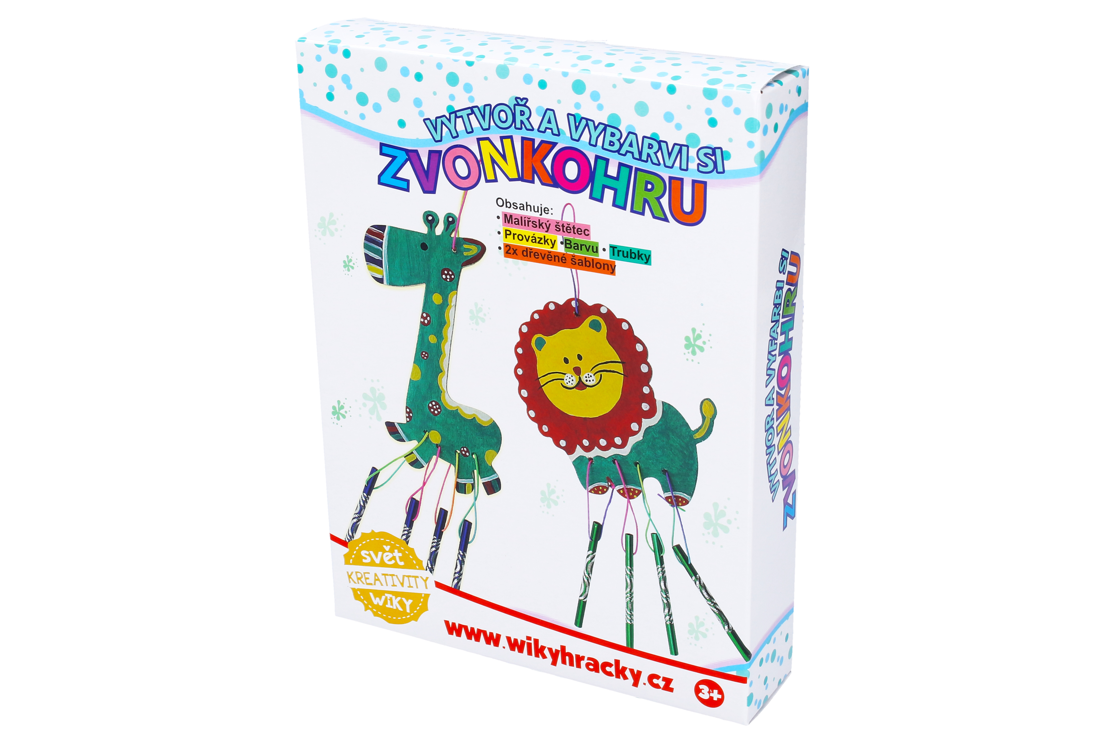 Kreativní set Zvonkohra. Vytvoř a vybarvi si zvonkohru. Obsahuje malířský štětec, provázky, barvu, trubky, 2x dřevěná šablona. przeczytaj całość