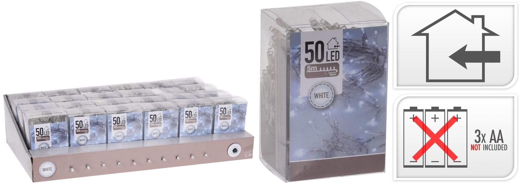 Vánoční světýlka - 50 LED žárovek. Barva žárovek - studená bílá. Pro vnitřní použití. Rozměry - délka 530 cm (500 cm kabel se žárovkami + 30 cm přívodní kabel). Baterie - 3x AA 1,5 V (nejsou součástí balení). przeczytaj całość