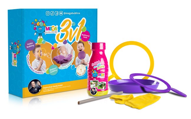 Wyduś dużą bańkę, odbijaj bańkę na dłoni, zagraj w bańkowy tenis! Luksusowy zestaw upominkowy z najlepszym płynem do baniek! Megabąbel 3 w 1. 1. Duże bańki 2. Skaczące bańki 3. Bańkowy tenis Zestaw zawiera: - Płyn do baniek Megabąbel 250 ml - płyn o wyjątkowej i oryginalnej recepturze - 2 x pierścień do puszczania dużych baniek - 2 x materiałowy pokrowiec - Miseczka na płyn - Rurka do mniejszych baniek Wyduś dużą bańkę, odbijaj bańkę na dłoni, zagraj w bańkowy tenis! Megabąbel jest na rynku od 2011 roku, s