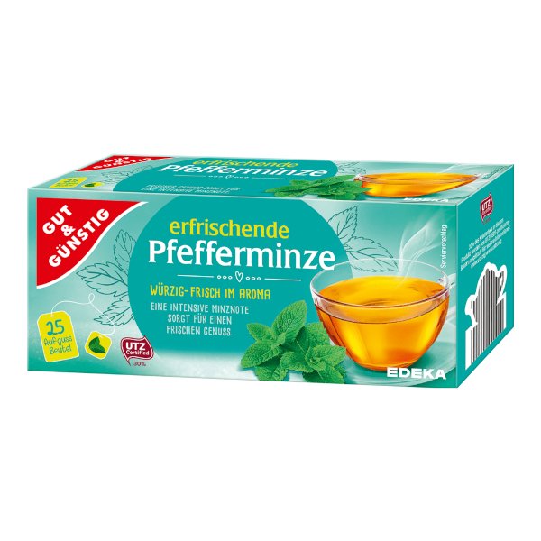 GG Bylinný čaj z máty peprné 25 sáčků, 56,25gAromatickou mátu zná asi každý pro její příjemnou mentolovou vůni a chuť. Podporuje normální činnost trávicího traktu a střev. Vyrobeno v Německu.Zalévejte vždy vařící vodou a nechte louhovat minimálně 5-6 minut. przeczytaj całość
