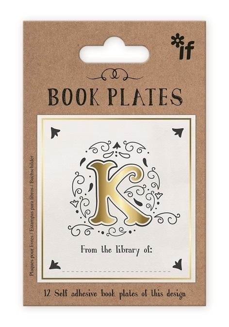 Zestaw 12 samoprzylepnych ekslibrisów z literą K. Naklejki są złocone. Całość zapakowana w eleganckie opakowanie kraft. Doskonały dodatek do prezentu dla mola książkowego. przeczytaj całość