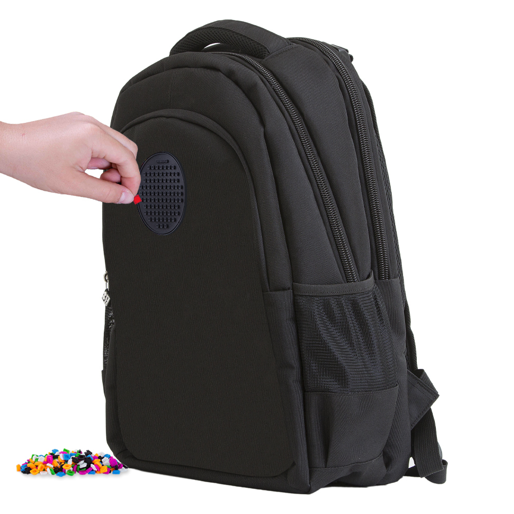 Dno plecaka jest zabezpieczone dwoma ochronkami przed otarciami i jest usztywnione, co częściowo zapobiega odkształcaniu zawartości. Przednią kieszeń stanowi unikalny silikonowy panel PIXIE CREW creative panel TM w kolorze czarnym o rozmiarze 10 x 10 oczek. Masz więc 97 pozycji na nieskończoną ilość wzorów na każdy dzień dzięki PIXIES (pikselom), które możesz w każdej chwili zdjąć i wymienić na inne. Do każdego plecaka dołączamy bezpłatnie zestaw około 50 małych PIXIES (pikseli) oraz mini galerię jako inspirację. Z niej możesz także korzystać na stronie pixiecrewgallery.com. Dla nieograniczonej twórczości polecamy dokupić małe PIXIES, które oferujemy w 24 kolorach, albo PIXIES z literami lub multipiksele (piksel o rozmiarze 2x2 oczka) z obrazkami.