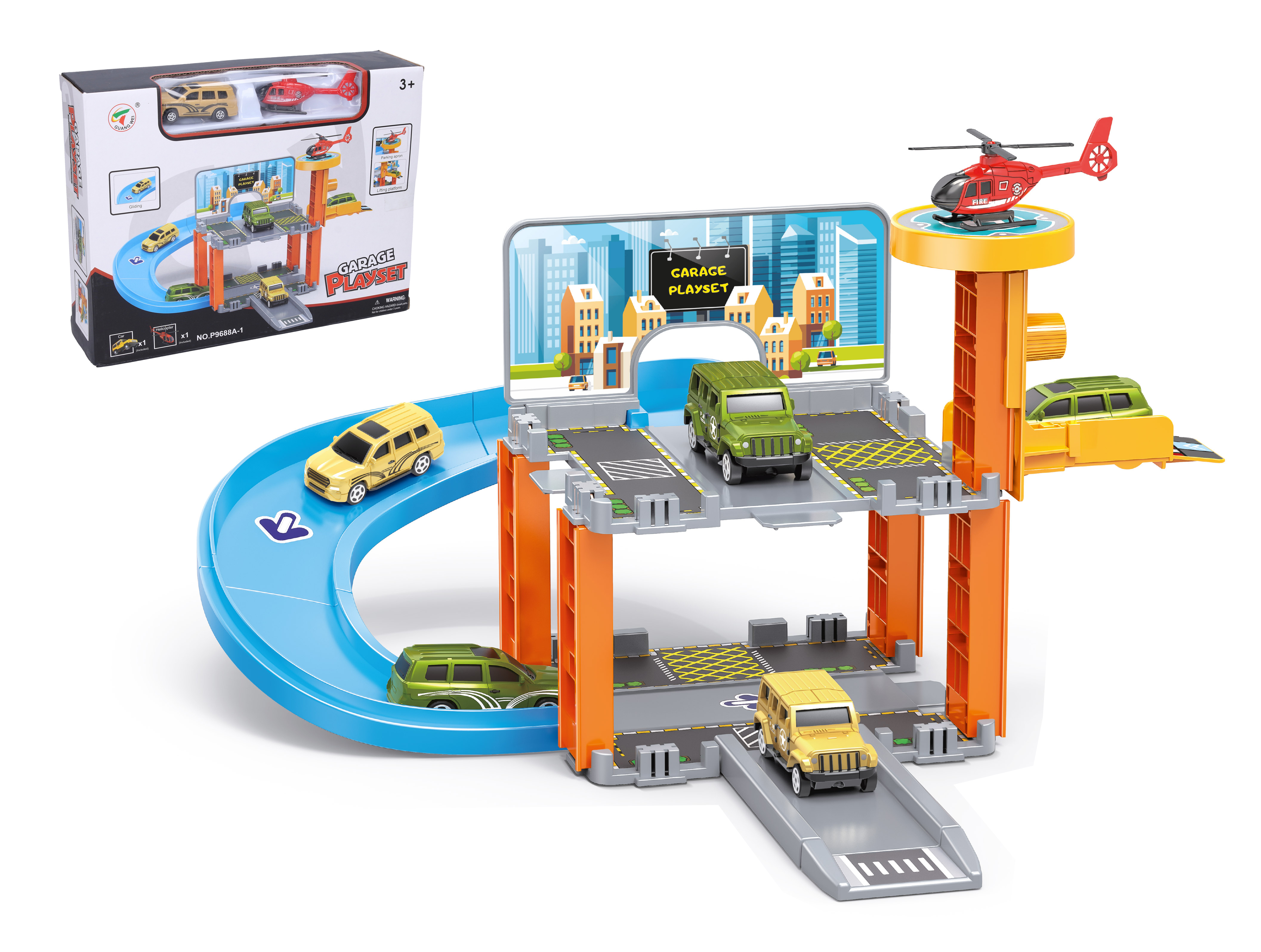 Zbuduj własną stację parkingową z garażem.  Wymiary 34,5 x 39,5 x 20 cm. W zestawie jedno auto (volne koła), jeden śmigłowiec, helikopter oraz manualna winda. Zalecany wiek: 3+ przeczytaj całość