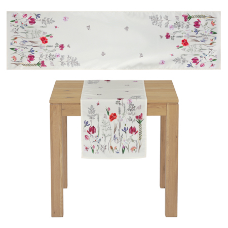Běhoun s motivem lučních květů krémové barvy. Rozměr 40x150 cm. Materiál 100 % polyester. Praní na 30°C. przeczytaj całość