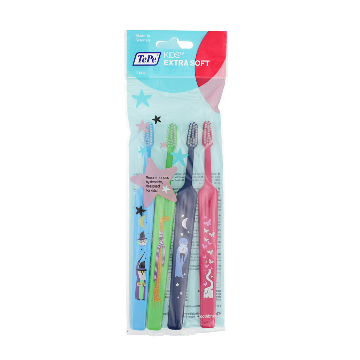 TePe Kids Extra Soft dětské zubní kartáčky (tmavě růžový, tmavě modrý, zelený, azurový) 4 ks