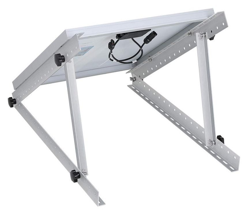 Trojúhelníková konstrukce s nastavitelným úhlem sklonu pro uchycení solárního panelu na plochou střechu nebo jiný podklad.