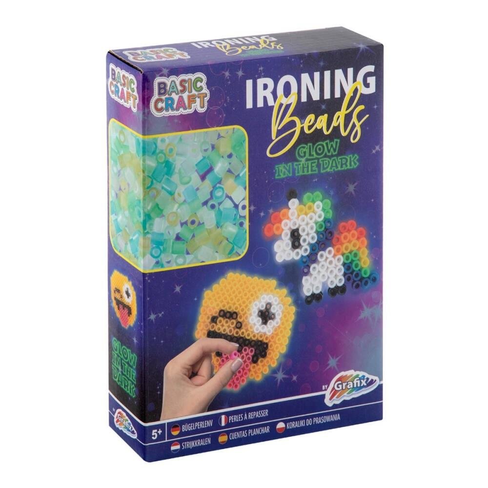 W zestawie znajdują się 2 woreczki z koralikami, 2 kwadratowe szkiełka do tworzenia przeróżnych wzorów, 2 cienkie kartki papieru. Koraliki świecą w ciemnościach. Po ułożeniu wzoru z koralików, należy przyłożyć rozgrzane żelazko. Koraliki do prasowania przeznaczone są dla dzieci powyżej 5 roku życia.