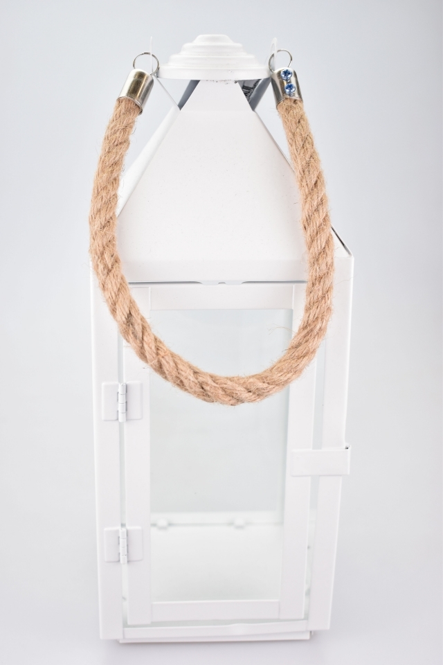 Kovová lucerna s jutovým uchem. Stylová dekorace do interiéru i ven na terasu, zahradu či balkón.Barva: bíláMateriál: kov, skloRozměr:výška 29 cmšířka 11,5 cmdélka 11,5 cm przeczytaj całość