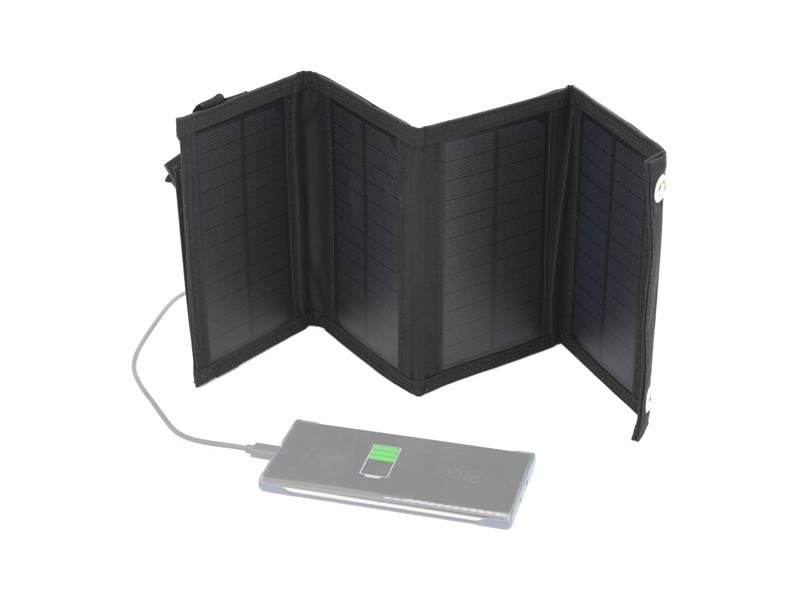 Ładowarka słoneczna jest odpowiednia do ładowania telefonów komórkowych i innej drobnej elektroniki. Idealna do użycia podczas wycieczek, na pikniku i w kempingu. Zestaw o wymiarach 44 x 16,5 cm składa się z czterech paneli (ogniw) o sprawności 19,5% i mocy do 10 W. Panele wystarczy rozłożyć i umieścić na słońcu, ewentualnie za pomocą dołączonych karabińczyków zawiesić np. na plecaku i przy pomocy okablowania USB (nie jest dołączone) połączyć moduł ładowania panelu z ładowanym urządzeniem. Do przechowywania urządzenie można złożyć i zabezpieczyć za pomocą pasków, uzyskując wymiary 11 x 18,5 x 3 cm.