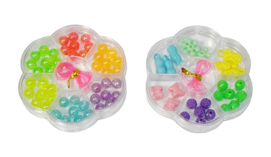 Kolorowe koraliki dla dzieci. Jedne klasyczne występują w 6 kolorach, drugie są w kształcie m.in.: kwiatków, owoców, motylków. w opakowaniu znajdują się 2 pudełka z koralikami. Produkt zapakowany w przezroczysty worek.Produkt dla dzieci od 3 lat. przeczytaj całość