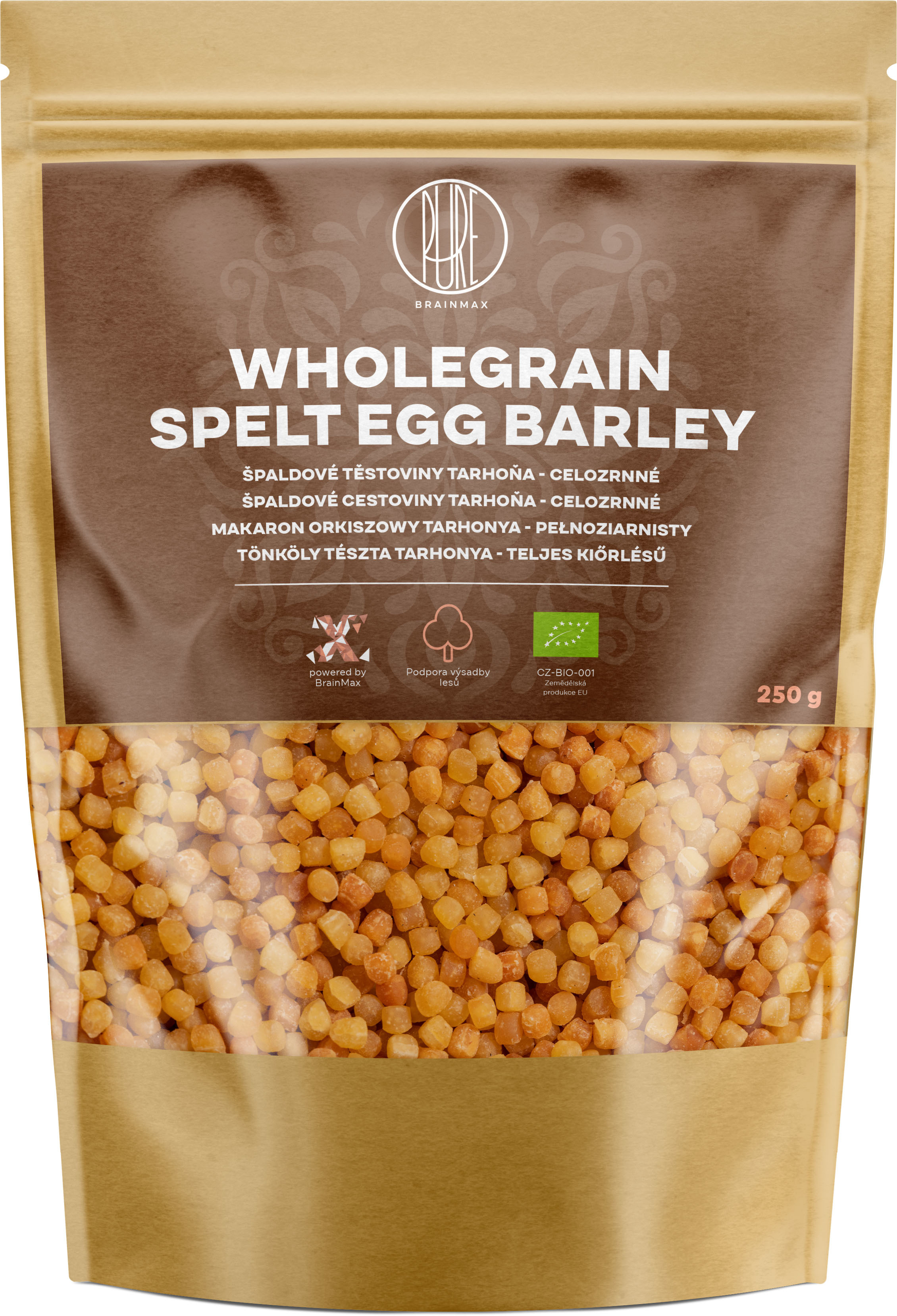 BrainMax Pure Špaldové celozrnné těstoviny, tarhoňa, BIO, 250 gTarhoňa je drobná těstovina, která má své kořeny na Slovensku a Maďarsku. Zde je často používanou těstovinou podávaná k masu, používá se jako zavářka do polévek, ale lze ji také použít do salátů. Je vyrobena ze špaldy, což je pšenice...