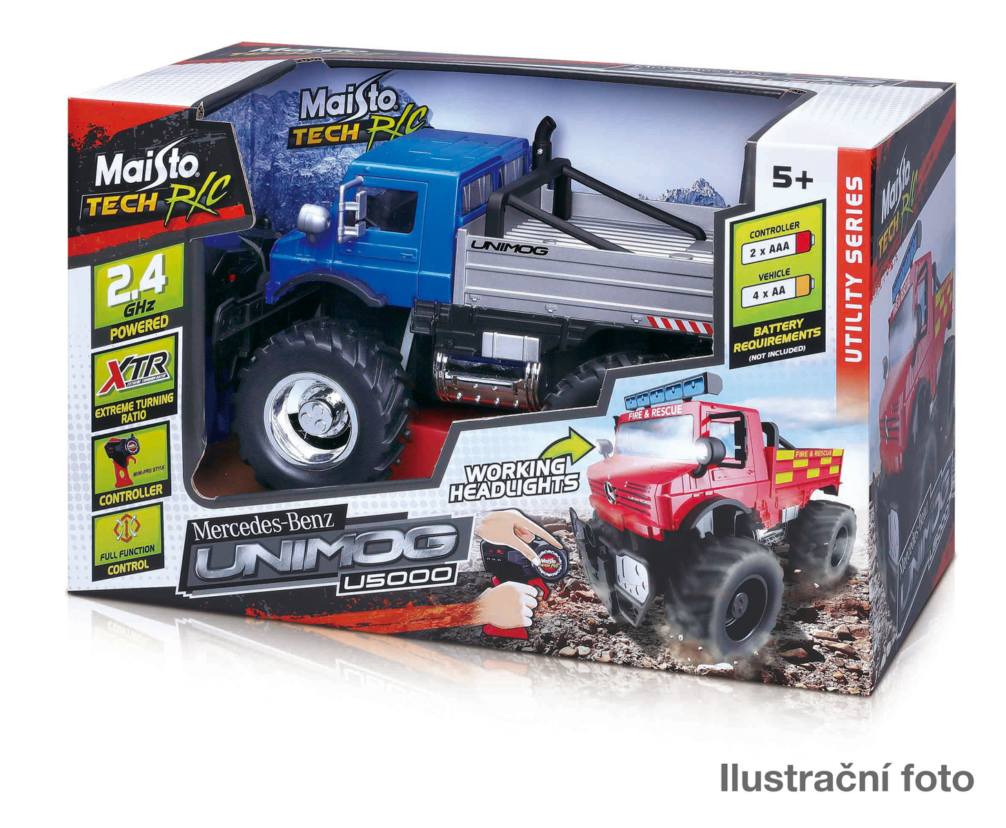 Tech RC, Mercedes-Benz Unimog U5000. RC model Unimog. Kromě jízdy vpřed & vzad a zatáčení vpravo & vlevo má i funkční přední světla. Potřebuje celkem 6 tužkových baterií, které nejsou součástí balení ( 1,5V AA - 2 do vysílače a 4 do modelu. Má 3 kanály = souběžně můžou jezdit až 3 nákladní...