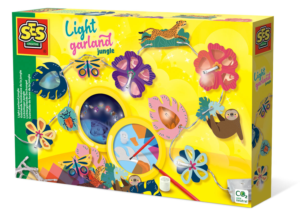 Vyrobte si svou vlastní světelnou girlandu z džungle do své ložnice. Tato sada obsahuje světelnou girlandu s osmi LED světly, pěti barevnými celofánovými listy, lepidlo, štětec, zvířátka z džungle a květiny. Spousta nástrojů k vytvoření dokonalé girlandy. Až půjdete večer spát, tato světelná girlanda z džungle krásně rozzáří váš pokoj. Baterie (2x AA) nejsou součástí balení. Věk: 6+