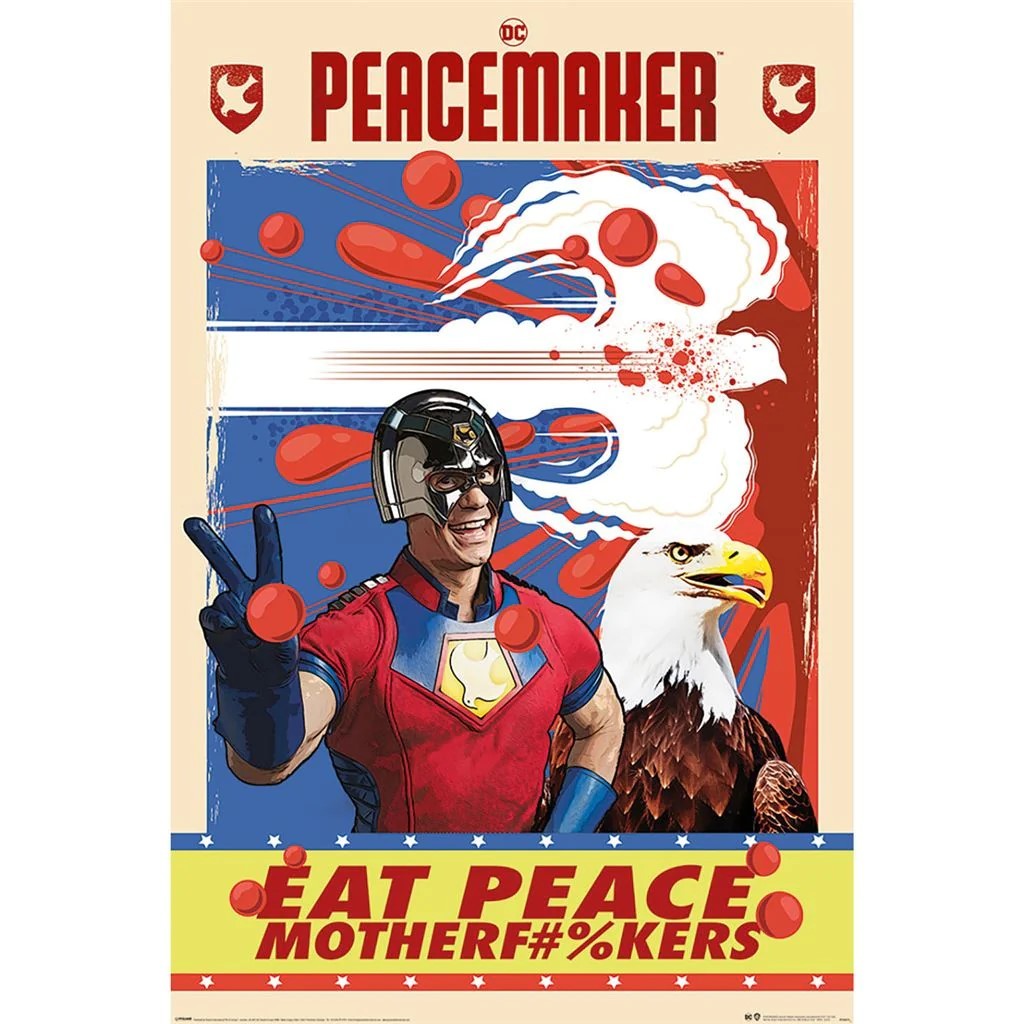 Plakat z grafiką Peacemakera i jego wiernego orła Eagly z serialu Jamesa Gunna. To prawdziwa ozdoba kryjówki każdego fana, który traktuje pokój śmiertelnie poważnie. przeczytaj całość