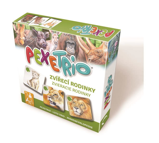 Pexetrio ZWIERZĘCE RODZINKI to gry dydaktyczne i zabawne, podczas których nauczysz się rozpoznawać różne umaszczenie i wygląd samca, samicy oraz młodego u poszczególnych gatunków zwierząt. Udoskonalone pexeso oferuje kilka wariantów gry. Pexetrio ZWIERZĘCE RODZINKI to zabawne gry inspirowane pexesem, które jednocześnie edukują dzieci. Gracze uczą się nazywać i rozpoznawać u różnych zwierząt wygląd samca, samicy i młodego zgodnie z zasadą „nauka przez zabawę”. Poza tym, że gracze w zabawny sposób uczą się rozróżniać tatę, mamę i dziecko różnych gatunków zwierząt, gra pomaga także rozwijać ich logiczne myślenie i ćwiczyć pamięć poprzez szukanie trójek kart z rodzinami zwierząt. Gra zawiera wytrzymałe kartoniki z twardej tektury o wymiarach 58 x 58 mm, arkusze do kilku wariantów dodatkowej gry LOTO-TRIO dla najmłodszych graczy oraz mini encyklopedię, która zawiera podstawowe informacje o poszczególnych gatunkach zwierząt oraz instrukcje do wszystkich wariantów gry. Zasada gry pozwala na korzystanie z różnych wariantów gry dla graczy w różnym wieku. Gra może być rozgrywana już przez najmłodsze dzieci od 2-3 lat (zobacz gra LOTO-TRIO), dalej przez dzieci w wieku przedszkolnym (PEXE-DUO), dzieci szkolne, nastolatków, dorosłych graczy oraz seniorów. Podczas gry odwracane są TRZY kartoniki i szuka się TRÓJEK, które do siebie pasują! Każda trójka kartonów jest oznaczona tym samym znakiem identyfikacyjnym. Gracz, który znajdzie najwięcej trójek, wygrywa. Karty do gry mogą bardzo dobrze służyć w przedszkolach i szkołach jako pomoce edukacyjne. Grę produkują i wytwarzają czescy producenci.