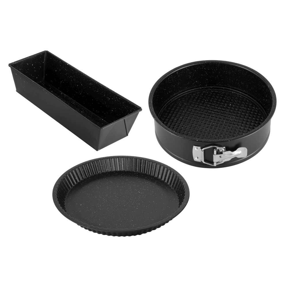 Sada 3 ks obsahuje: 1x forma na dort 24 x 6,5 cm 1x forma na koláč 29 x 3 cm 1x forma na chlebíček 31 x 11,5 x 6,8 cmUhlíková ocel s dlouhou životnostínepřilnavý povrch s mramorovým designem ProcalonVnější povrch odolný proti teplu przeczytaj całość