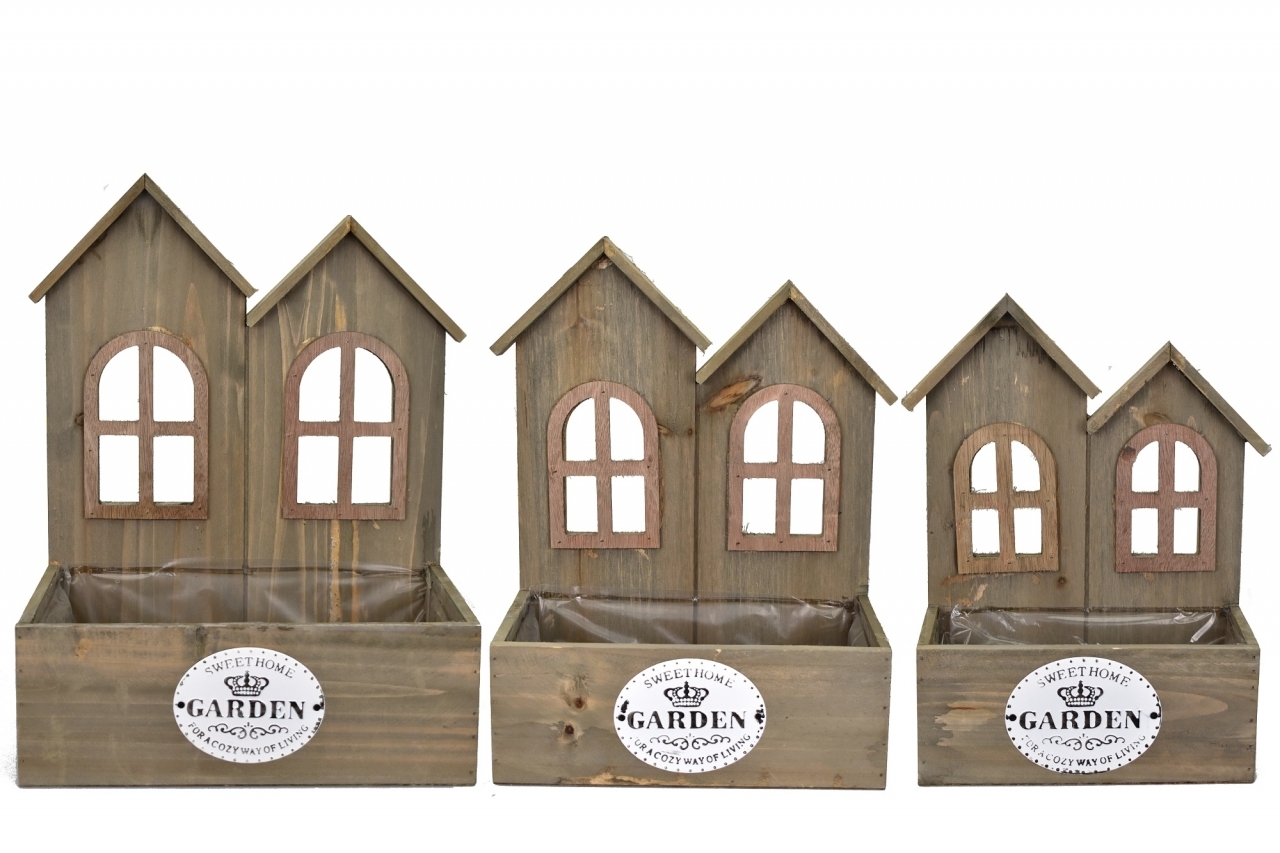 Sada 3 ks dřevěných květináčů s pozadím v podobě domečku. Každý květináč s igelitovou výplní.Materiál: dřevoRozměry:velkývýška celkem 41,5 cmšířka 33 cmhloubka 17,5 cmkvětináč 11x30,5x17,5 cmstřednívýška celkem 36 cmšířka 30 cmhloubka 13,5 cmkvětináč 10x26,5x13,5 cmmalývýška celkem 31 cmšířka 25... przeczytaj całość
